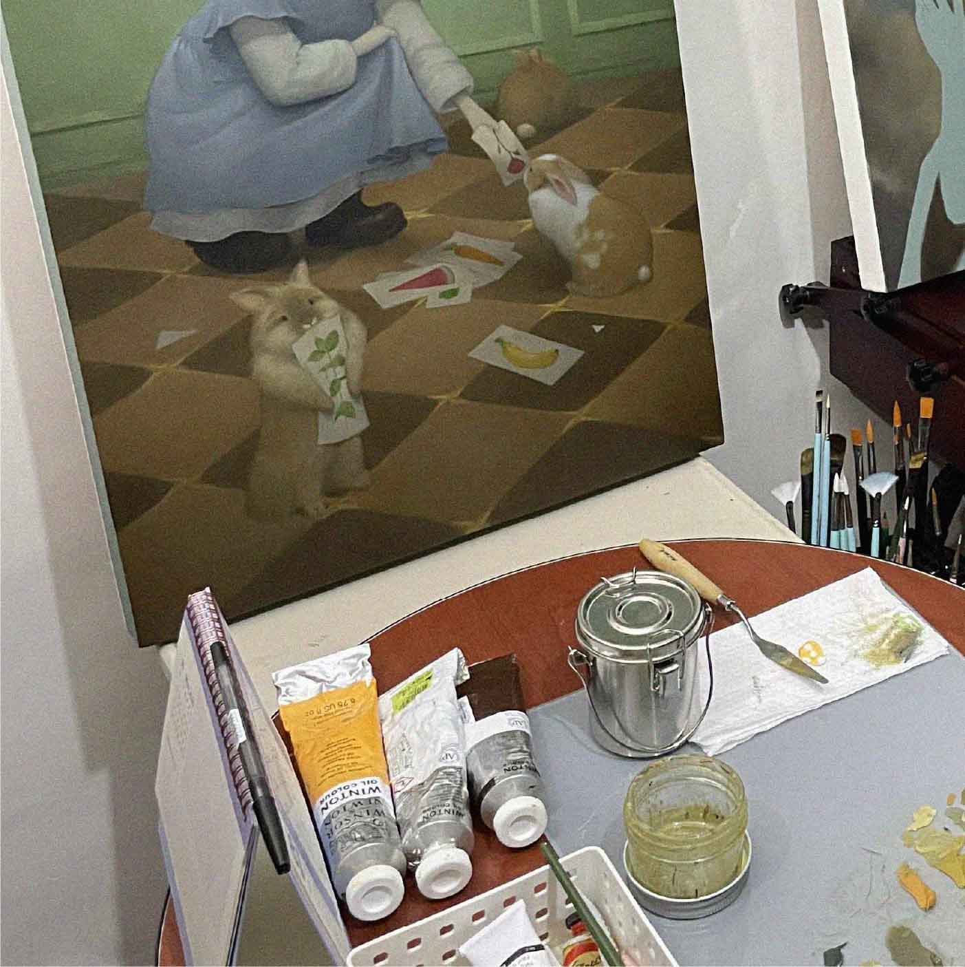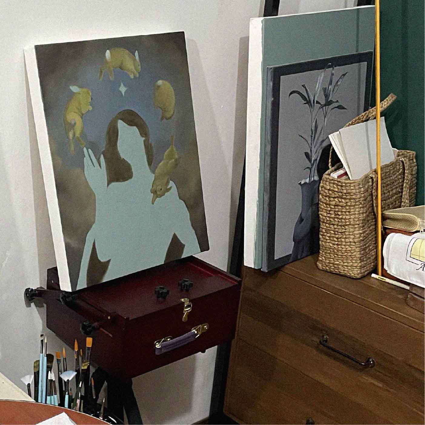 I mostly use Gamblin oil paints and Gamblin painting mediums, and only utilizing acrylic paints for color blocking. And after our family moved in our new place, I've slowly converted my room into a mini studio. Majority of my set up is making use of resources already available to me, such as unused furnitures, etc. Also, I order canvases from "rolens canvas" on Facebook!